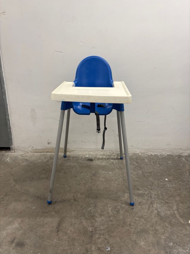 Trona para bebés con asiento azul y bandeja blanca. - Estructura de patas metálicas. - Arnés de seguridad.