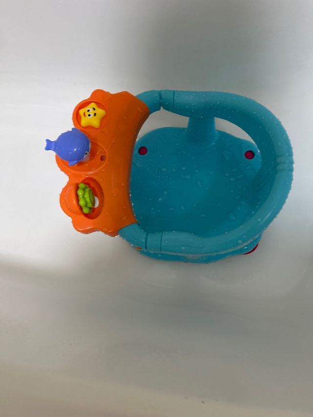 Detalles del productoPreciosa trona para el baño, ideal para la hora del baño de tu bebé. Es de color azul y naranja, y está en muy buen estado.