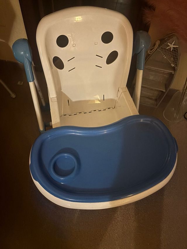 Detalles del productoTrona para bebé en color blanco con detalles en azul. Es cómoda y práctica para las comidas.