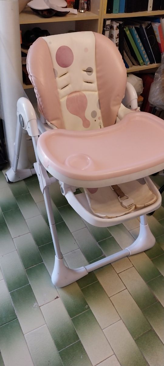 Detalles del productoPreciosa trona para bebé, en color rosa y blanco, con diseño de lunares. Es plegable para facilitar su almacenamiento.