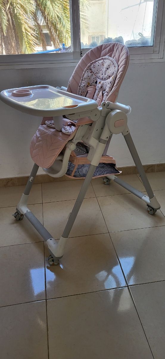 Detalles del productoPreciosa trona para bebé, en color rosa y gris, con diseño elegante y acolchado. Es plegable para facilitar su almacenamiento.