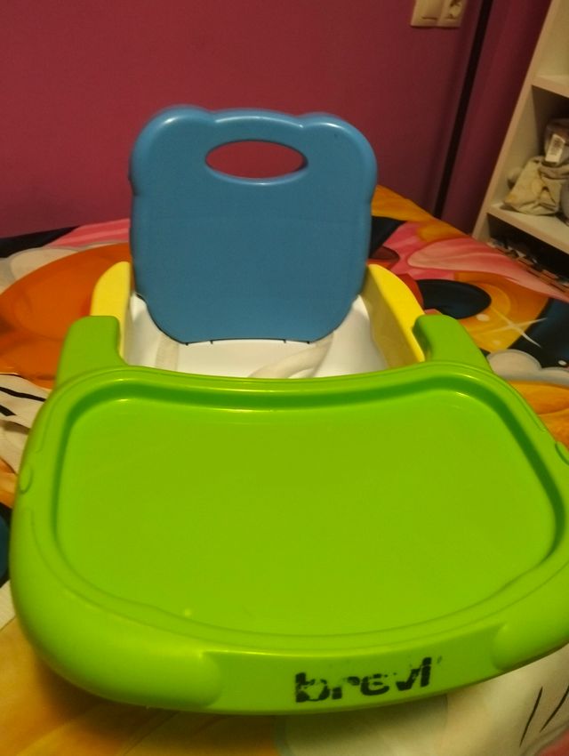 Trona de la marca Brevi, ideal para las comidas. - Color verde y azul. - Bandeja amplia. - Respaldo con asa.