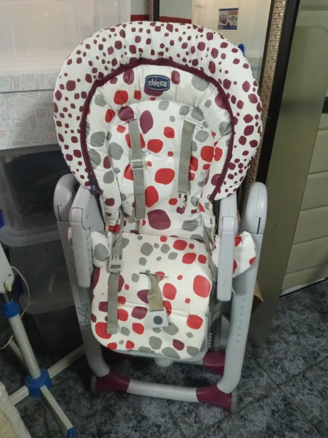 Detalles del productoTrona Chicco modelo Polly Progress con un divertido estampado de lunares en tonos rojos, grises y burdeos sobre fondo blanco. Es plegable para facilitar su almacenamiento.