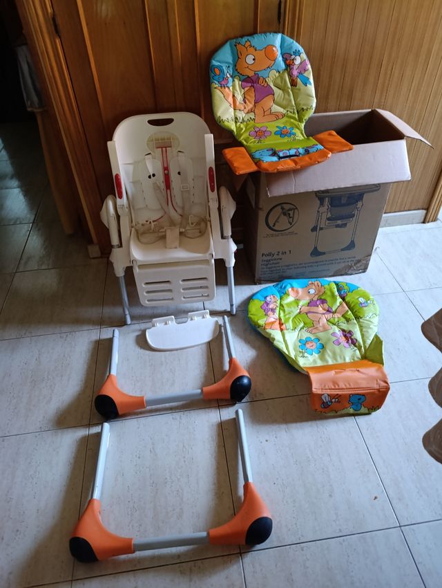 Detalles del productotrona Chicco Polly 2 in 1 es una trona que se puede poner para comer en mesa alta, o para poner en mesita baja para que juegue el niño, incluso se tumba para dormir. Tiene dos protectores de plástico, lo único que se nos perdió la bandeja, entonces puede comer pero en la mesa .