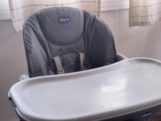 Trona Chicco Polly Easy en color gris. Un asiento cómodo y seguro para los más pequeños. - Asiento acolchado. - Arnés de seguridad. - Bandeja extraíble.