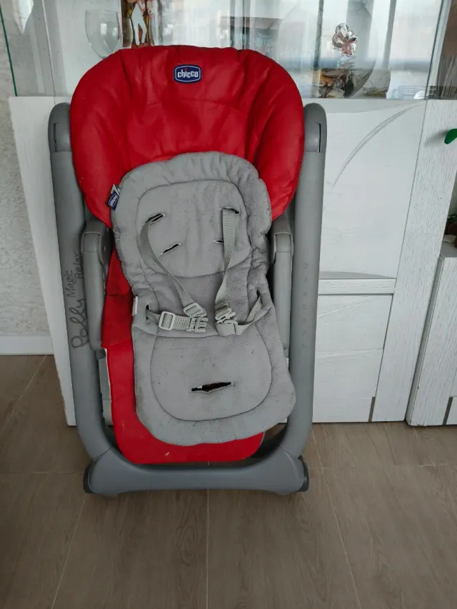Detalles del productoTrona Chicco Polly Magic Relax en color rojo y gris. Es reclinable y plegable para facilitar su almacenamiento.