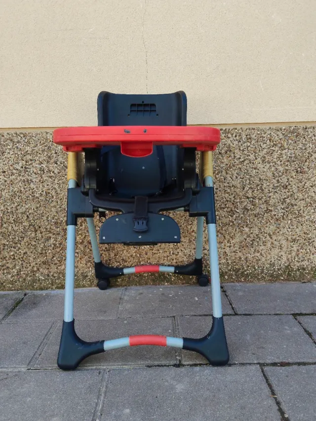 Detalles del productoTrona de bebé con estructura negra y detalles en rojo. Es un asiento cómodo y seguro para los más pequeños.