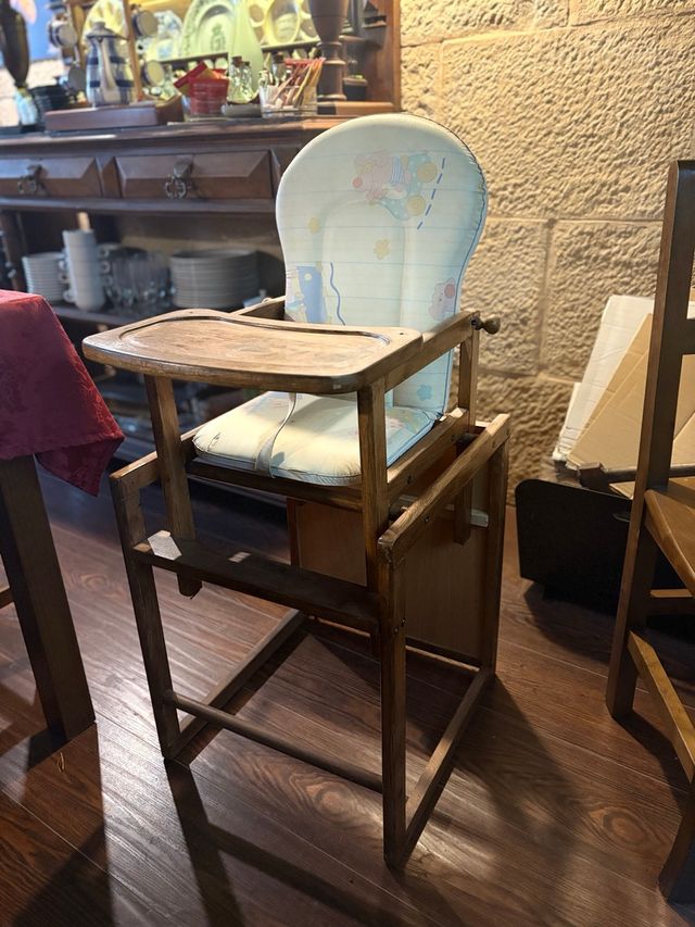 Trona de madera con cojín. - Cojín con estampado infantil. - Bandeja de madera. - Estructura de madera resistente.