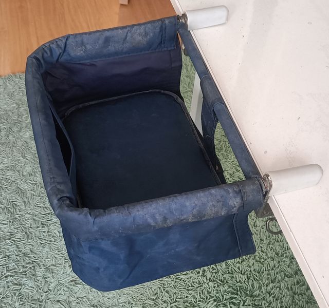 Trona de viaje en color azul, ideal para llevar a cualquier parte. Se sujeta a la mesa. - Tejido resistente. - Acolchado interior.
