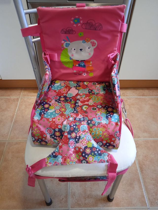 Detalles del productoTrona de viaje con un diseño infantil y colorido, ideal para llevar a cualquier parte. Presenta un estampado de flores y un dibujo de un osito.