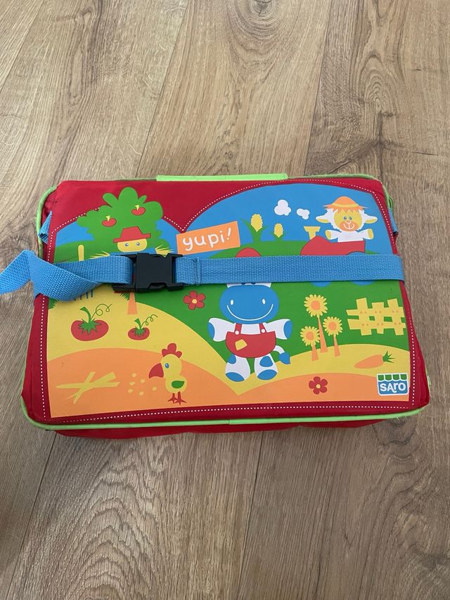 Detalles del productoTrona de viaje plegable con un divertido diseño de granja, marca Saro.