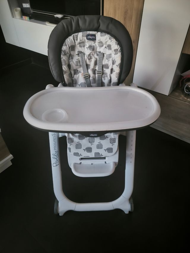 Detalles del productoPreciosa trona Chicco Polly Progress en buen estado (solo tiene un par de manchas en la tapicería como se puede apreciar en la última foto, se podría sustituir ya q hay repuestos en internet, del resto en perfecto estado). 5 configuraciones diferentes: Hamaca, trona, silla de mesa, asiento elevador confort y asiento elevador compacto.Desde los 0 a los 36 meses. Nueva costó 230 euros.