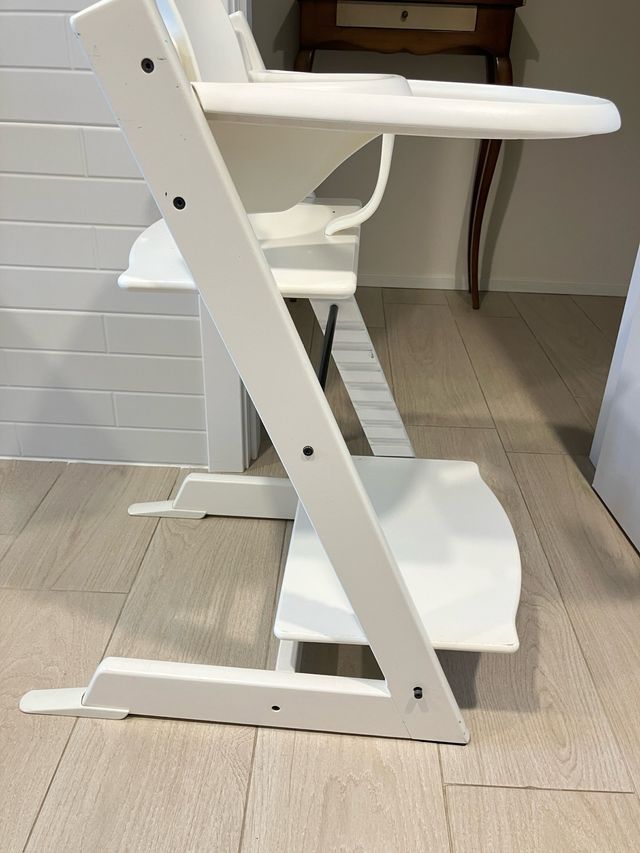 Detalles del productoTrona evolutiva Stokke en color blanco. Diseñada para crecer con tu hijo, ofrece comodidad y seguridad.