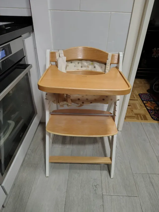 Detalles del productoTrona Hauck de madera con funda de tela.