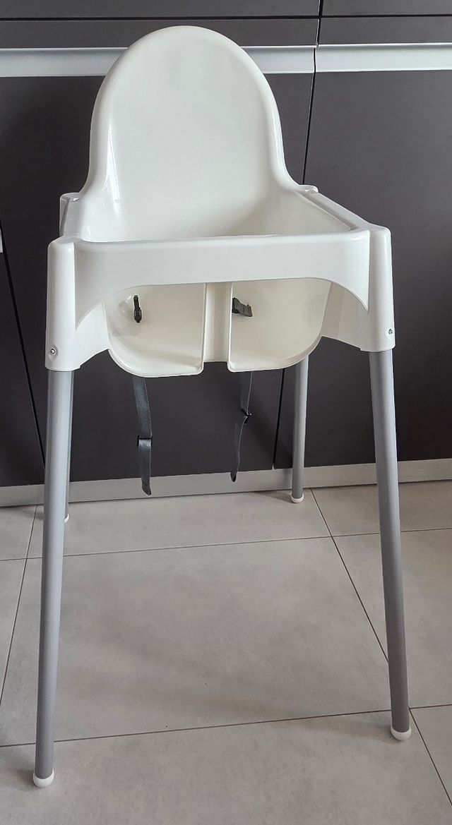 Trona de bebé de la marca IKEA, ideal para las comidas. Incluye la bandeja nueva ya que no se usó. - Asiento blanco. - Patas grises.
