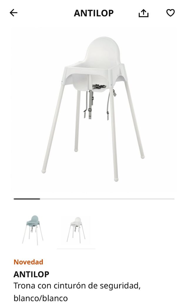 Trona modelo ANTILOP de IKEA en color blanco. Es fácil de limpiar y transportar. - Incluye cinturón de seguridad. - Patas estables.