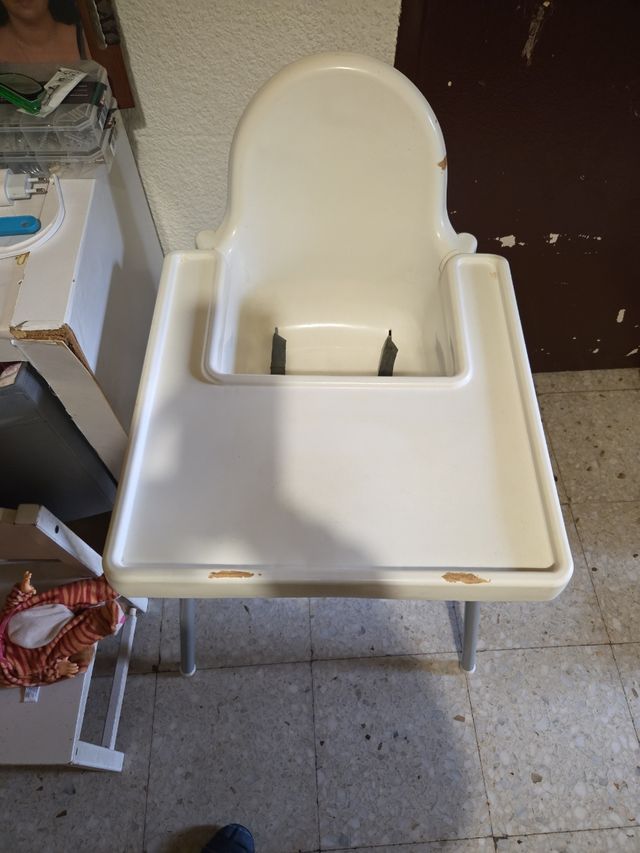 Detalles del productoTrona de bebé de IKEA en color blanco. Ideal para las comidas de los más pequeños. Tiene algún resto de precinto de haber estado guardada, que se puede quitar facilmente con alcohol.