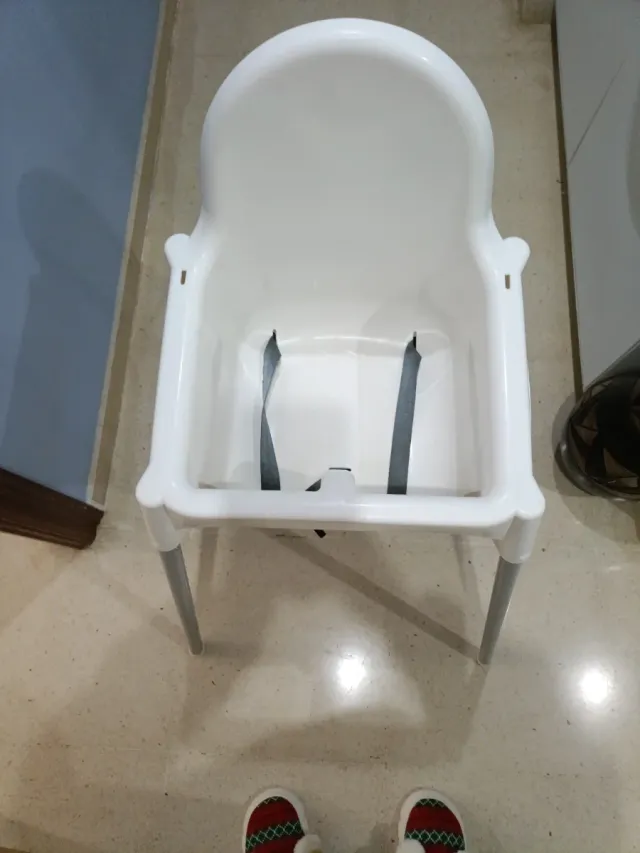 Detalles del productoTrona de bebé de la marca IKEA. Es de color blanco y cuenta con cinturón de seguridad.