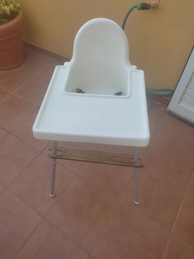 Detalles del productoPreciosa trona de Ikea, blanca, con un práctico adaptador de madera para los pies.