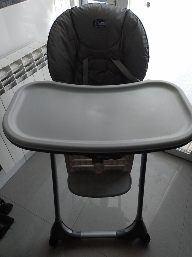 Trona polly marca chicco. Poco uso porqué estaba en una segunda casa. Se puede desmontar para lavar todo (tirantes, asiento...). También tiene 4 ruedas con freno.