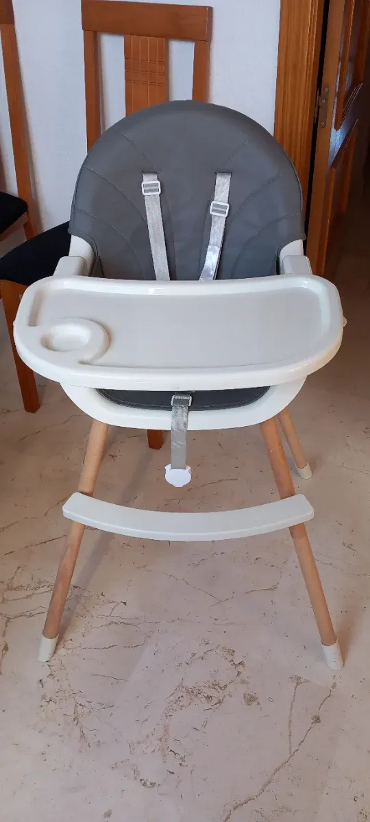 Detalles del productoTrona infantil de color gris, con patas de madera y bandeja.