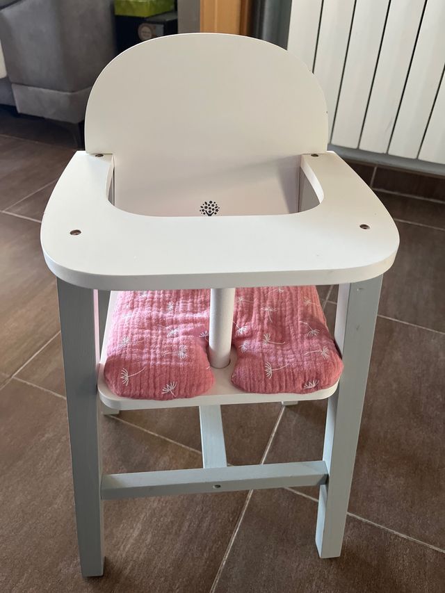 Trona de madera para muñecas. Ideal para jugar a cuidar de tus muñecos. - Diseño blanco y gris. - Incluye cojín rosa con estampado de flores blancas.