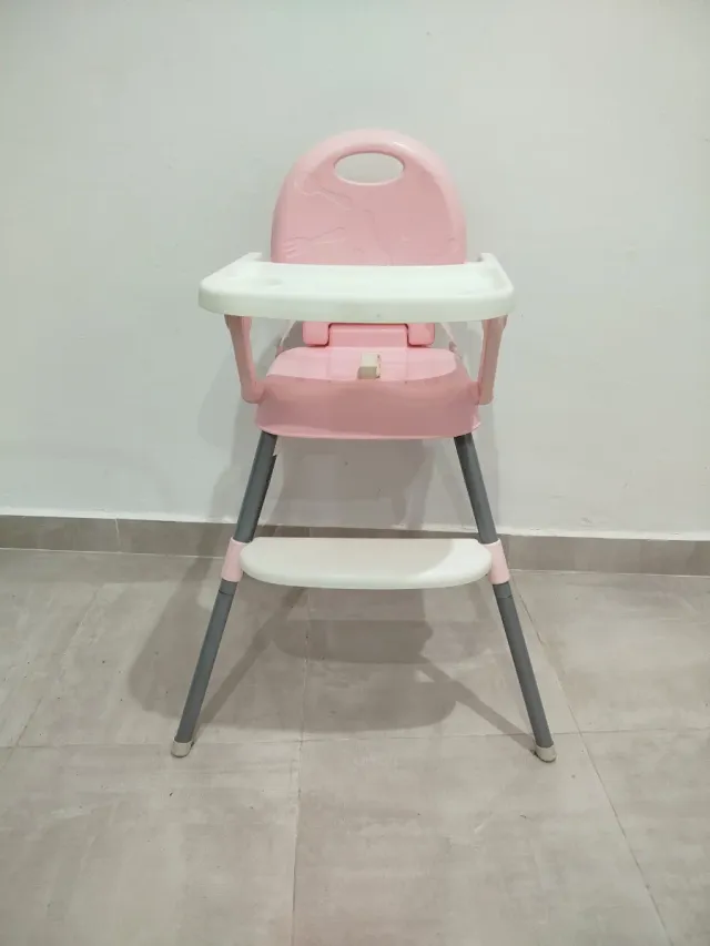 Trona infantil de color rosa y blanco, con bandeja. - Asiento y respaldo acolchados. - Bandeja extraíble. - Estructura de patas estable.