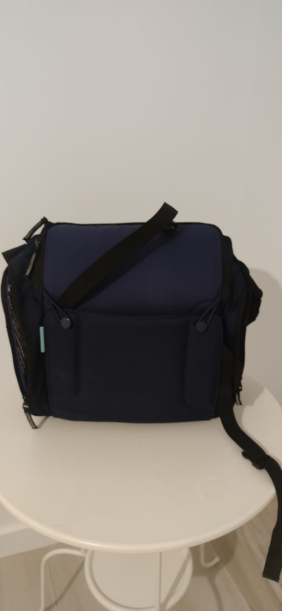 Muy útil y práctico. Se puede colgar en el manillar del carro. Tiene un compartimento para el frío, está descosido como se aprecia en la foto.