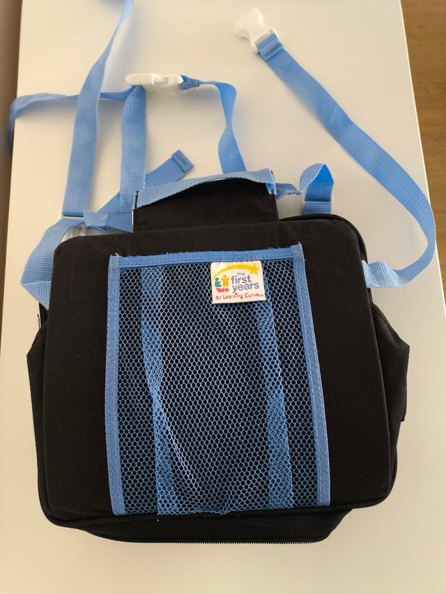Detalles del productoTrona portátil de la marca The First Years, ideal para llevar a cualquier parte. Es negra con detalles en azul y una malla frontal.