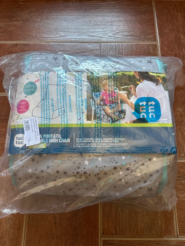 Trona portátil Tuc Tuc, ideal para llevar a todas partes. Sirve como silla y como bolsillo para la comida del bebé. - Diseño con estrellas. - Color gris y turquesa.