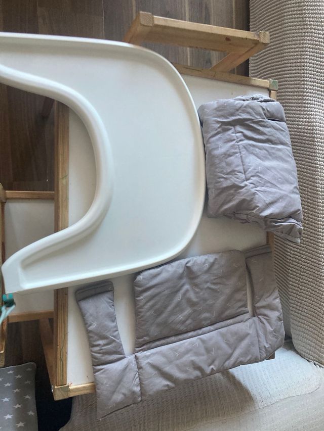 Trona Stokke en color blanco con cojín gris. - Bandeja y baby set blanco - tirantes de seguridad. - Cojín de asiento y respaldo gris.
