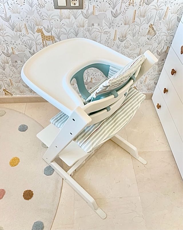 Trona infantil de color blanco, con un diseño moderno y funcional. - Bandeja extraíble. - Cojín a rayas verdes y blancas. - Estructura de madera.