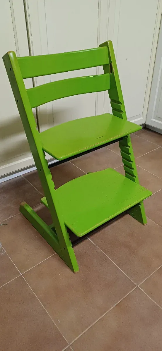 Trona Stokke Tripp Trapp de madera en color verde. - barra de seguridad - respaldo - cojín para respaldo - arnes