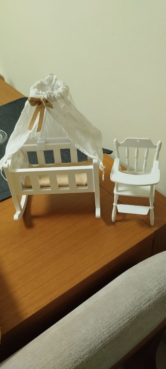 Set de trona y cuna para muñecas Barriguitas. Ideal para completar el juego. - Cuna blanca con dosel de tela. - Trona blanca con bandeja.