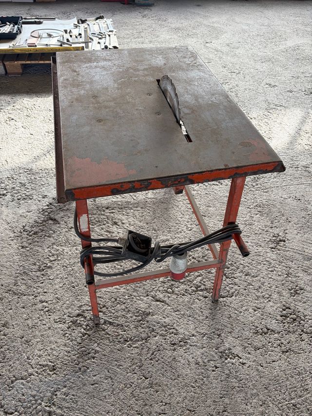 Tronzadora de carpintero con estructura metálica. - Superficie de trabajo metálica. - Hoja de sierra visible. - Cable de alimentación incluido.