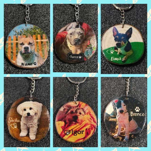Lleva tu mascota siempre contigo en un llavero único y exclusivo, estampado impreso en madera a todo color con la foto que más te guste, el regalo perfecto y original con el que seguro acertarás, foto a una cara 5€ y a dos caras con la misma foto o con otra distinta 8€.