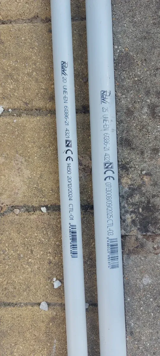 Detalles del productoSe venden dos tramos de tubería de PVC, uno de 10x20mm y otro de 10x25mm, ambos de 3 metros de longitud.