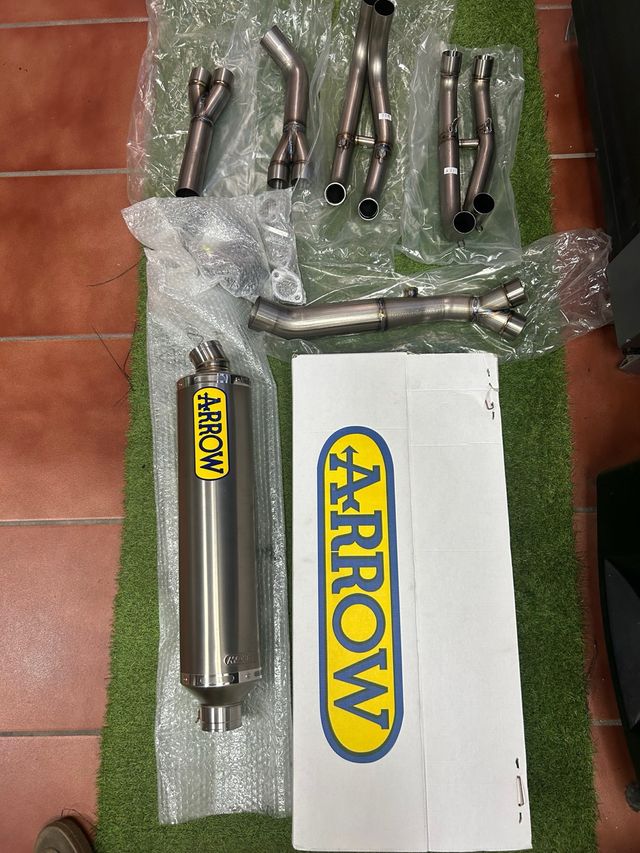 Sistema de escape completo de la marca Arrow. - Incluye colectores y silenciador. - Fabricado en titanio. - Desconozco para qué modelo de moto es. - Nuevo a estrenar