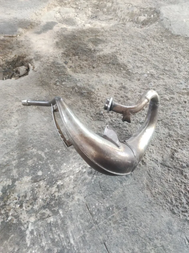 Tubo de escape para moto Derbi Senda. Pieza metálica con un diseño curvo característico. - Fabricado en metal. - Forma curva.