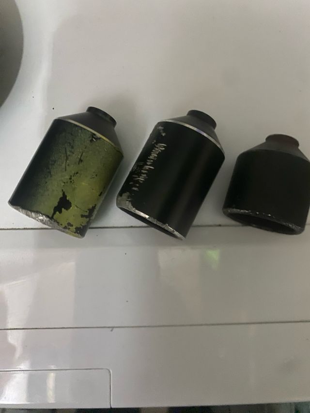 Detalles del productoTres tubos metálicos para las ruedas de patines scooter. Uno de ellos es de color verde y los otros dos son negros.