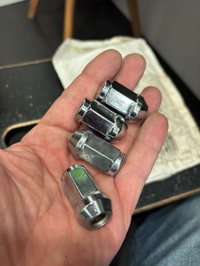 4 tuercas para ruedas de Rover Mini. - Acabado cromado brillante. - Diseño hexagonal para llave. - Rosca métrica visible.