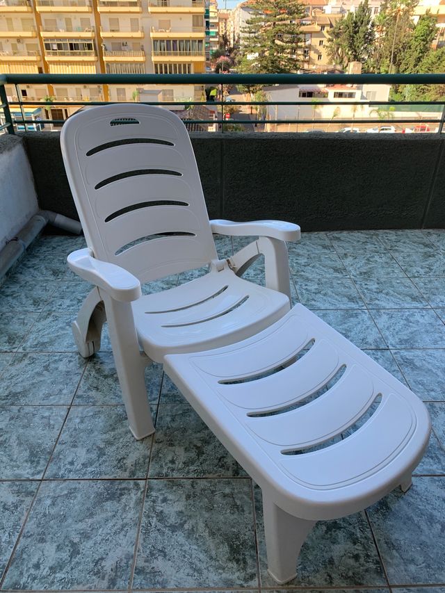 Tumbona blanca para terraza, jardín… con reposabrazos y ruedas. Material tecnopolímero blanco. Diseño italiano. Respaldo regulable en varias posiciones, se convierte fácilmente en sillón. Apilable. Está prácticamente nueva, muy poco uso. Venta en mano. No hago envíos.