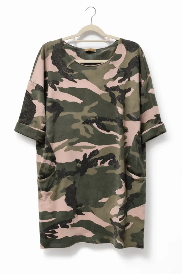 Túnica de estilo oversize con un llamativo estampado de camuflaje en tonos verdes y rosas, con detalles brillantes.