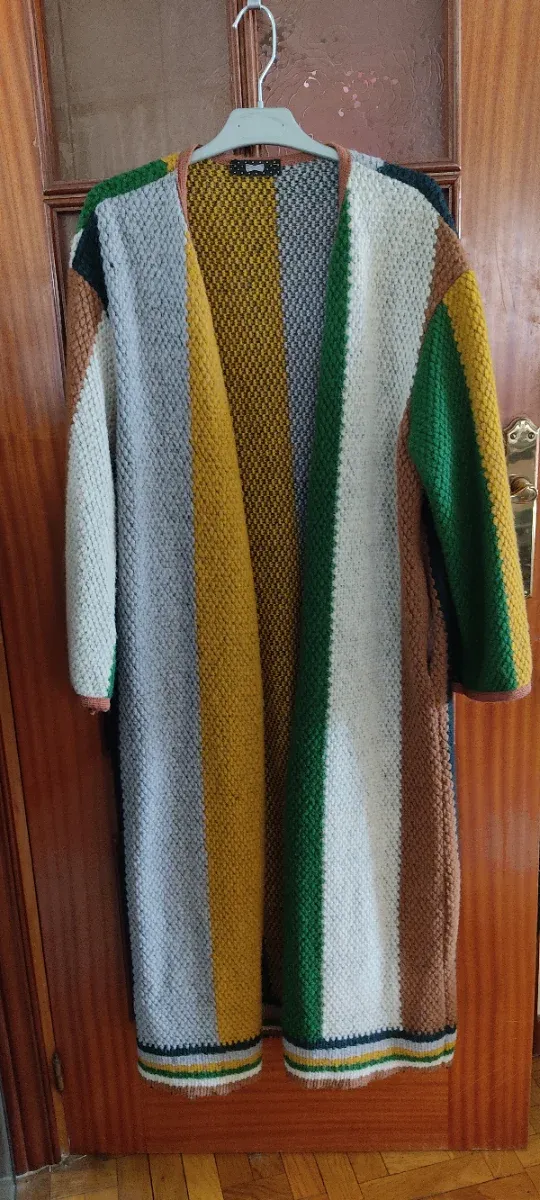 Túnica larga con un diseño de rayas verticales en diferentes colores. Es una prenda cómoda y versátil. Tejido de punto grueso.
