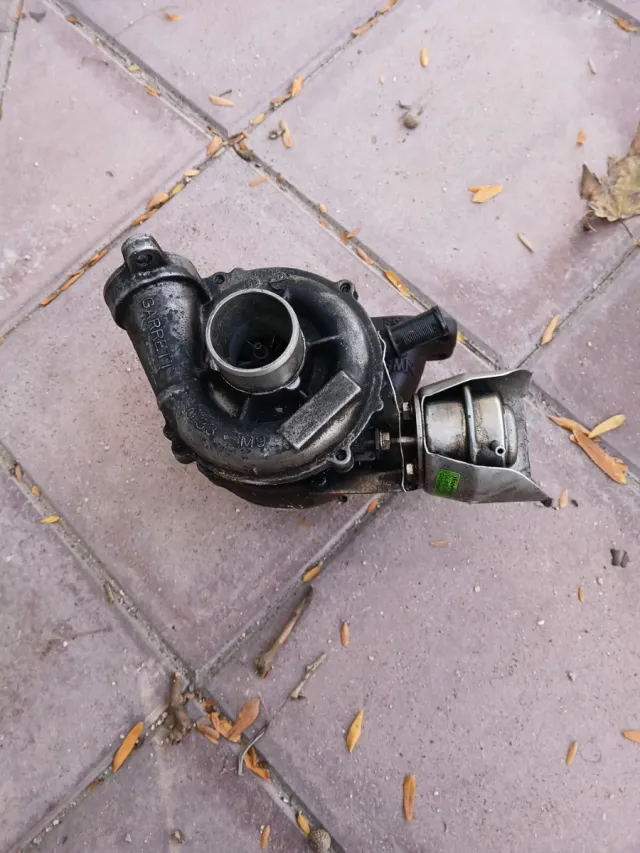 Turbo Garrett M9 usado. Se aprecia la marca Garrett en la carcasa. Lleba roto el tornillo - Modelo M9. - Carcasa de metal.