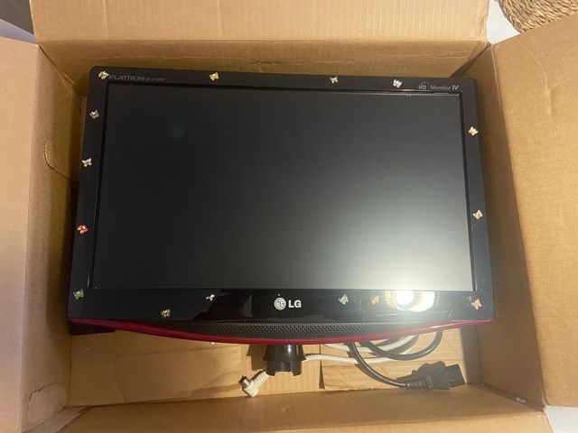 Tv plana de 19”. Tiene mando, base, cable y antena. Funciona perfectamente, poco uso. Las pegatinas se puedes quitar sin problema.