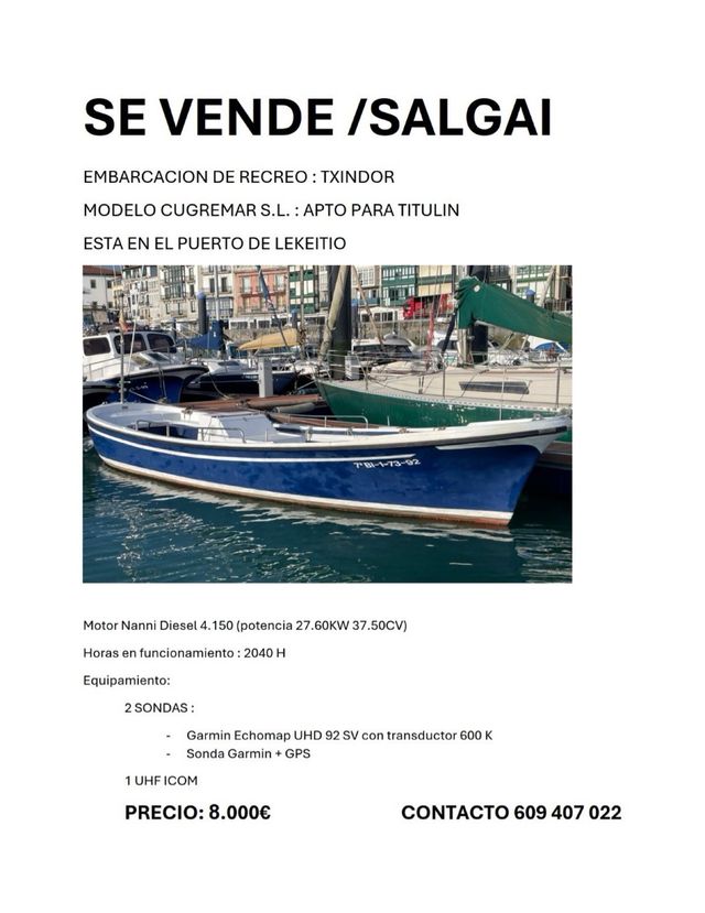 Detalles del productoEmbarcación de recreo TXINDOR, modelo CUGREMAR S.L., apta para titulin. Está en el puerto de Lekeitio. Es una embarcación azul y blanca, que parece estar en buen estado.