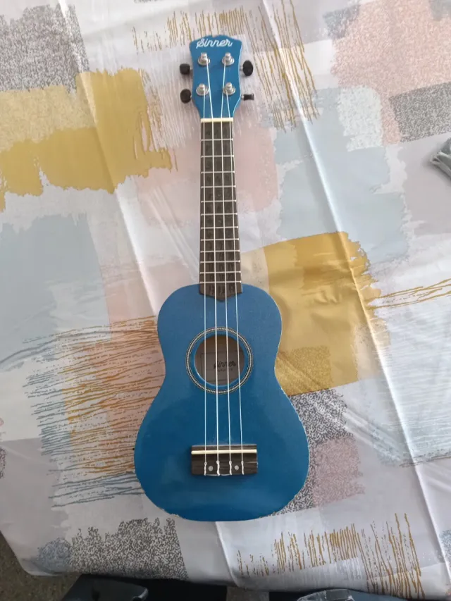 Ukelele de color azul, marca Sinner. Ideal para iniciarse en la música. - Cuerpo de madera. - Cuatro cuerdas. - Clavijero con afinadores.