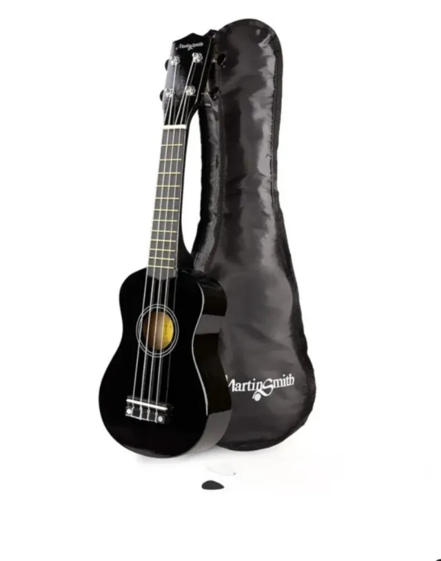 Martin Smith UK-212-BK Ukelele Soprano 21", Funda de transporte, Una púa, Cuerdas de nylon, Color Negro (Acabado brillante).