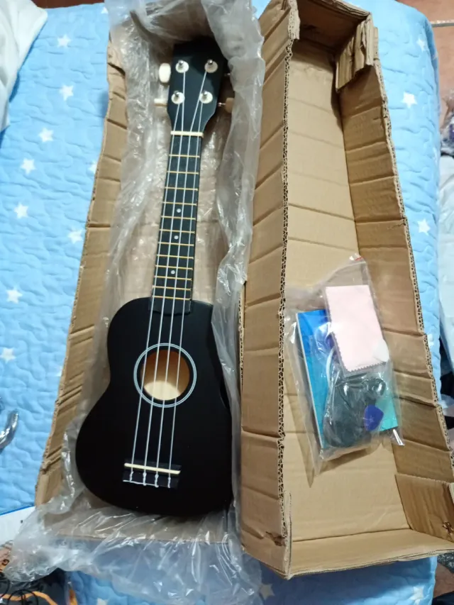 Ukelele negro, ideal para iniciarse en la música. - Cuerpo de madera. - Cuerdas de nylon. - Incluye accesorios.